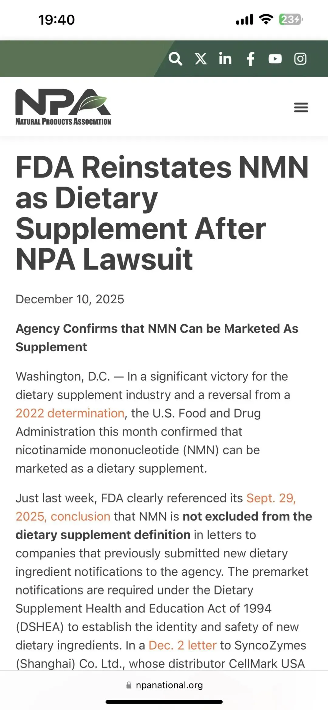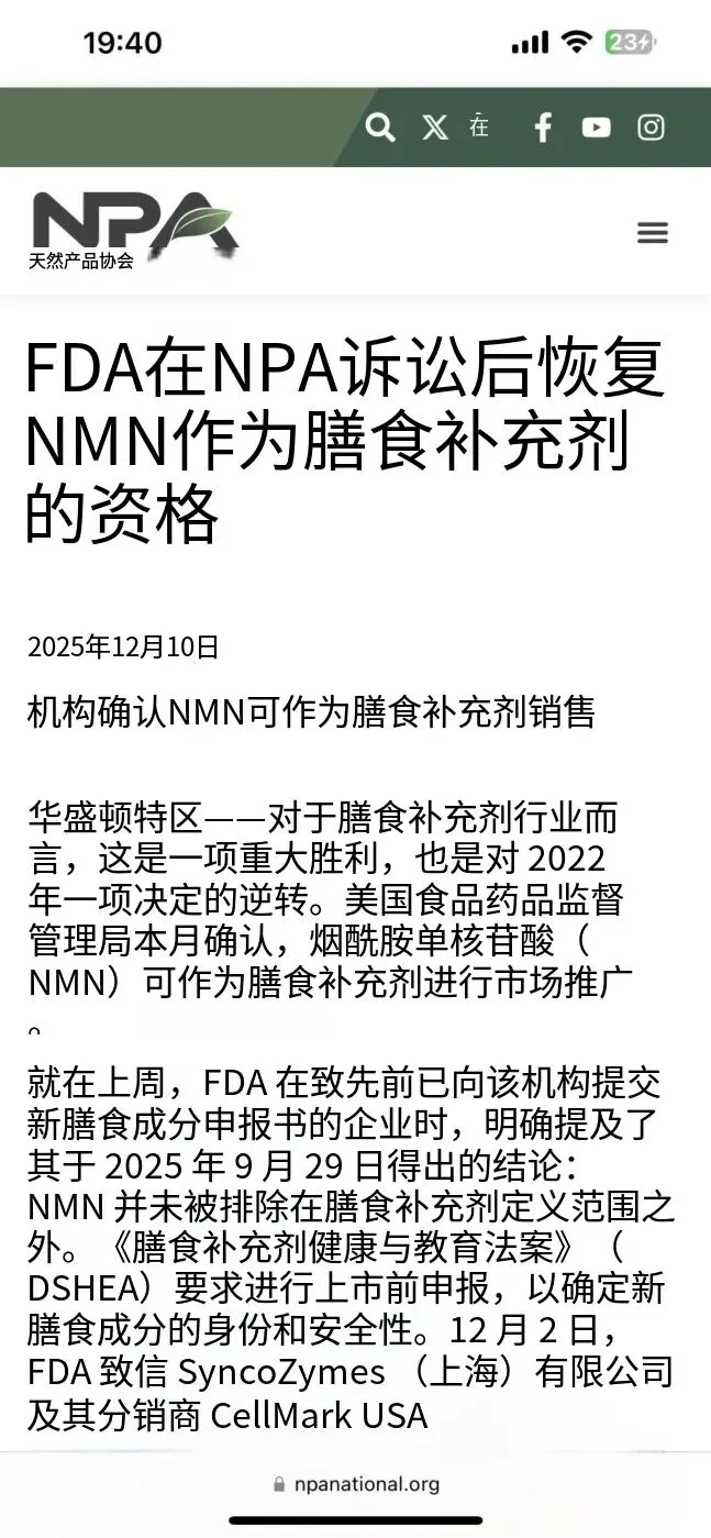 这一转折始于FDA对2022年监管决定的正式逆转。2022年,FDA曾援引《膳食补充剂健康与教育法案》(DSHEA)中的“药物排除条款”,以NMN涉及新药研究为由,将其排除在膳食补充剂定义之外,导致全球NMN市场陷入合规困境。此后,美国天然产品协会(NPA)联合行业力量发起公民请愿并提起诉讼,推动监管复核进程。2025年9月29日,FDA正式得出核心结论:NMN早在2017年便已作为膳食补充剂在美国合法销售,其上市时间早于新药研究授权,因此不应适用“药物排除条款”。12月2日,FDA向中国尚科生物(SyncoZymes)及其美国分销商CellMark USA发出官方信函,确认恢复其NMN新膳食成分申报的合法地位,为企业合规入市提供直接政策依据。
