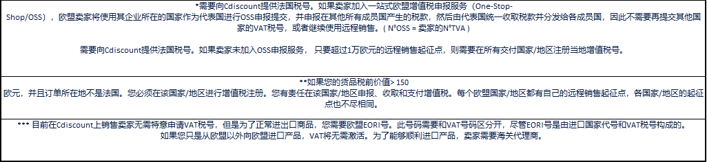 请您务必将IOSS号码以及Cdiscount的增值税号发送给您物流商,未提供 IOSS 编号,则可能会导致买家被要求支付额外的欧盟税费和关税。