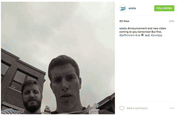 Wistia决定在企鹅套装中使用杰夫·文森特,这有助于构建“coming to [viewers] tomorrow.明天即将到来的观众”这样一神秘感。那些在Instagram上关注Wistia的人会感到“参与”到了这个公司的秘密中。像Wistia这样的网红互动参与是一种很好的方式,让我们的社交媒体关注者感觉他们是独家的一部分,这有助于建立客户忠诚度。