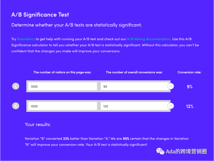 使用像Kissmetrics这样的A / B显着性测试来验证我们的发现。用户首先输入他们的整体页面访问量和转化次数。