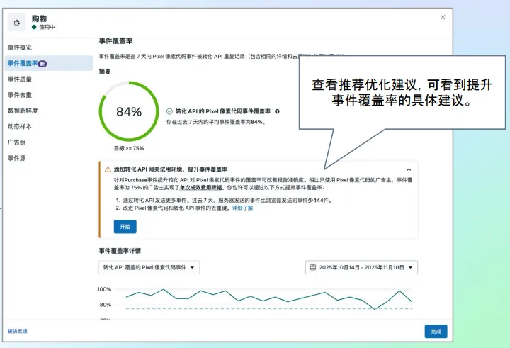 核心指标:CAPI覆盖率需高于35%。这代表超过三分之一的转化通过稳定服务器回传,数据根基更牢固。