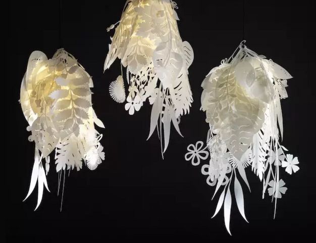 这个有意思,像一个花瓶里的植物倒挂下来,上面有至少 20 种不同的叶子或花。每一串上面带有一个小勾,组合在一起有剪纸的感觉。