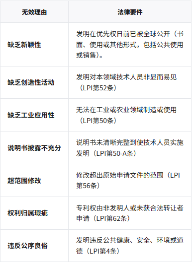 法律依据:专利无效的法定理由(LPI 第152条、153条)