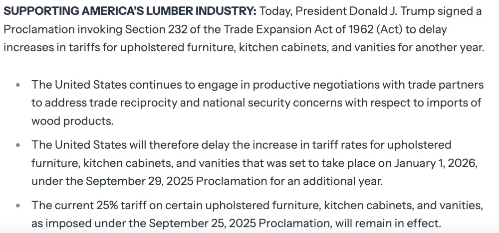 2025年12月31日,特朗普签署公告,决定将对软垫木质家具、厨房橱柜和梳妆台的加征关税措施推迟一年实施。