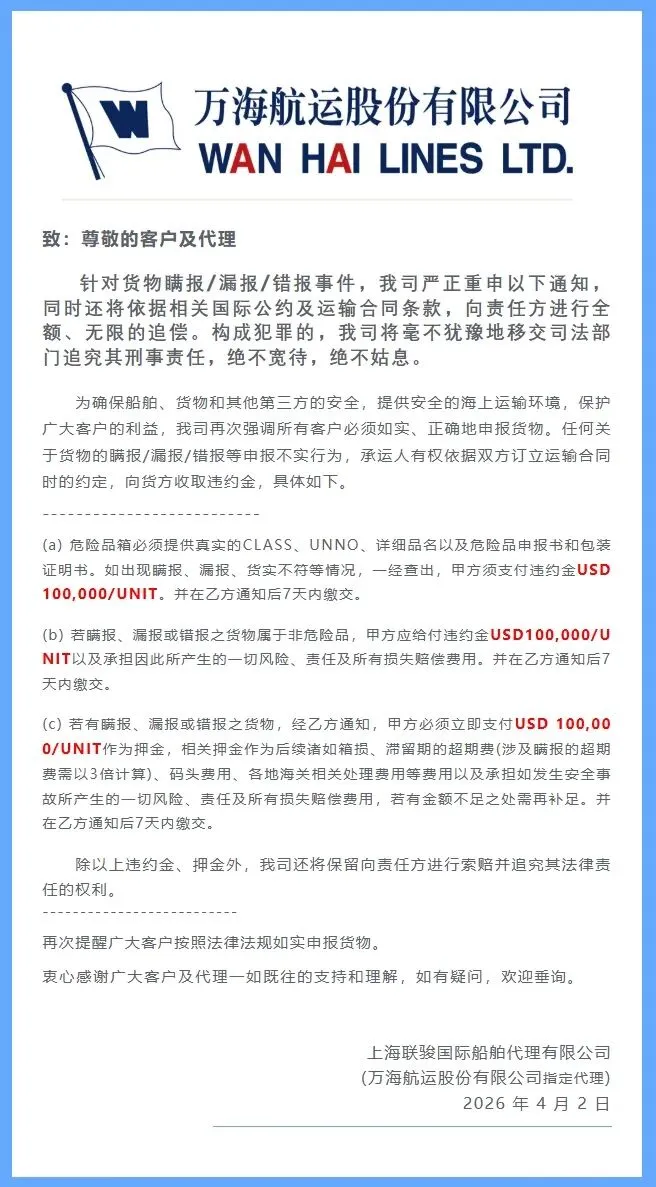 在航运安全风险持续上升的背景下,船公司对货物申报合规问题再度“亮剑”。近日,万海航运通过其代理发布重要通知,针对瞒报、漏报及错报行为作出严厉警示:单箱最高罚款可达10万美元,并明确将启动无限追偿及法律追责机制,释放出强监管、零容忍的强烈信号。