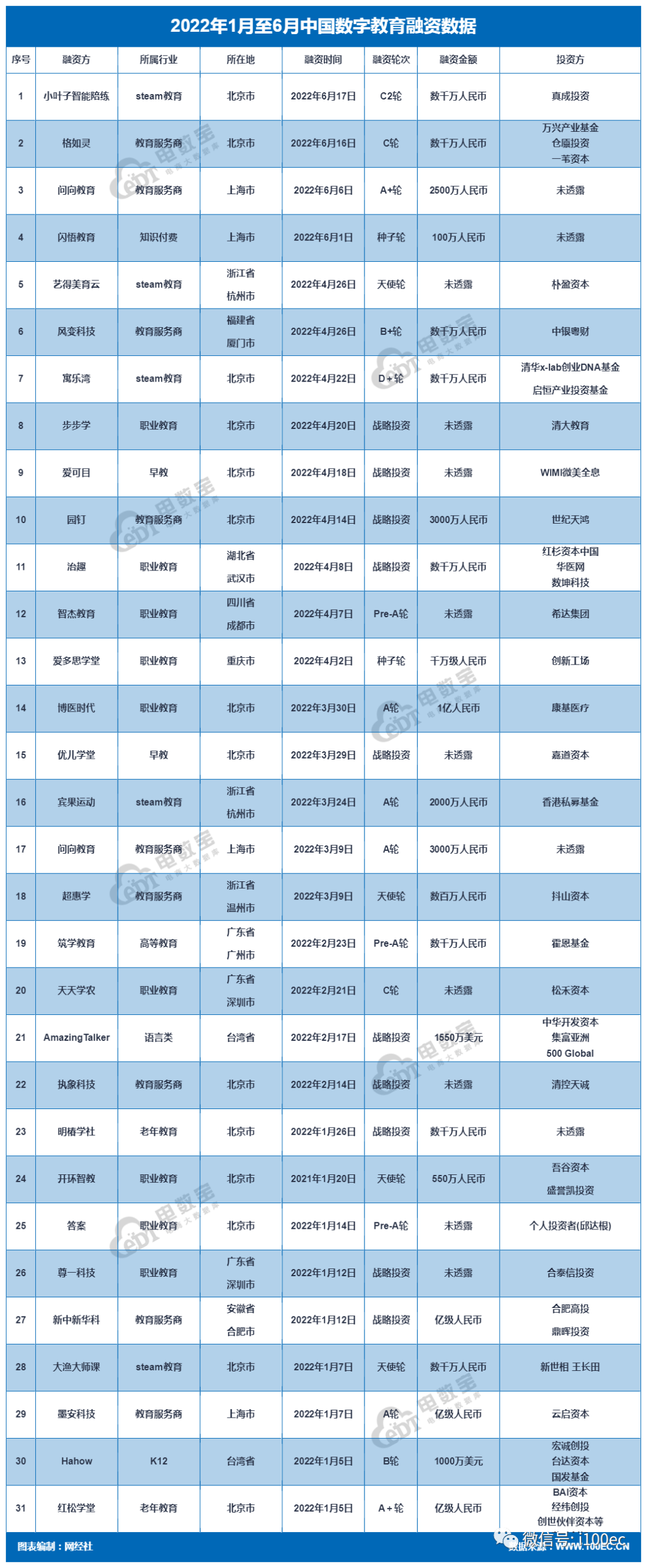 据网经社旗下大数据库“电数宝”(DATA.100EC.CN)监测数据显示,2022年1月1日至6月17日,在线教育领域共有31起融资,融资总额超8.5亿元,涉及的平台包括:小叶子音乐科技、格如灵、闪悟教育、风变科技、寓乐湾、步步学、爱可目、园钉、治趣、智杰教育、爱多思学堂、博医时代、优儿学堂、宾果运动、问向教育、超惠学、筑学教育、天天学农、AmazingTalker、执象科技、明椿学社、开环智教答案、尊一科技、新中新科技、墨安科技、Hahow、红松学堂。