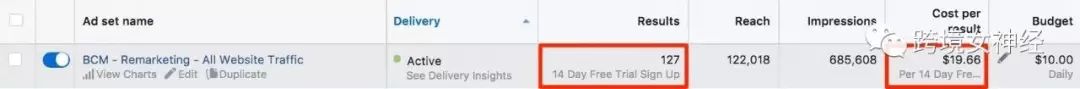 譬如下图可以看到,通过重新定位我们的网站流量,获得了14天免费试用注册,每个19.66美金。如果没有这个像素,我们就无法看到这个广告导致我们有127次注册的事实。