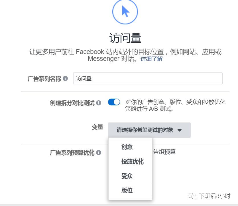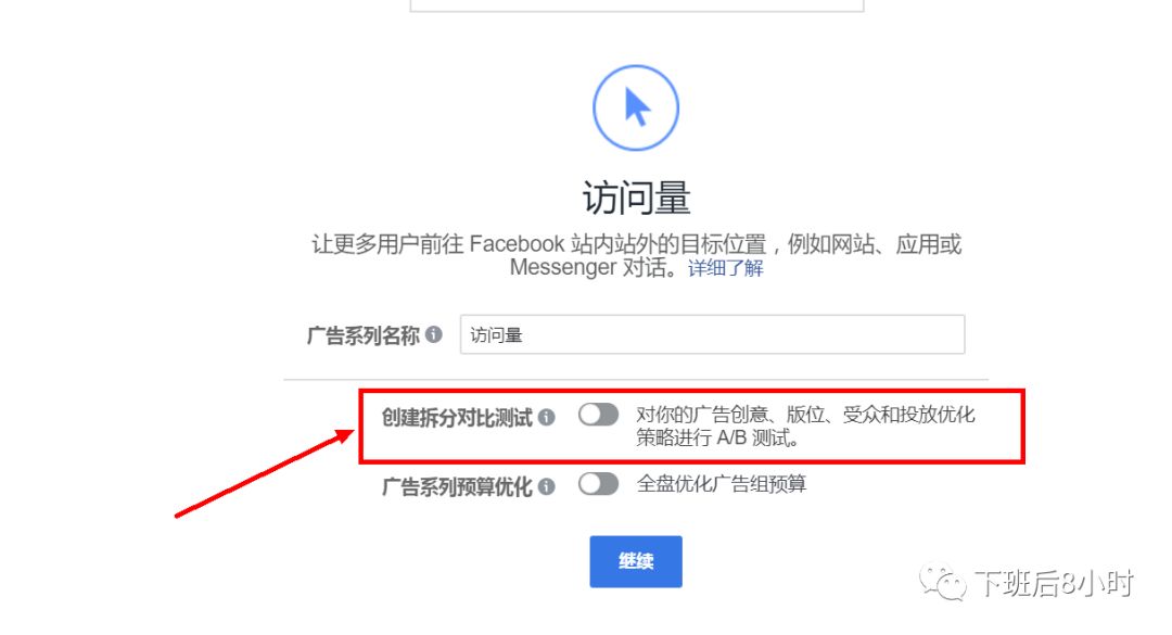 首先打开facebook ads manager https://business.facebook.com,创建广告系列,比如以“访问量”作为营销目标,然后点击下面"创建拆分对你测试按钮"