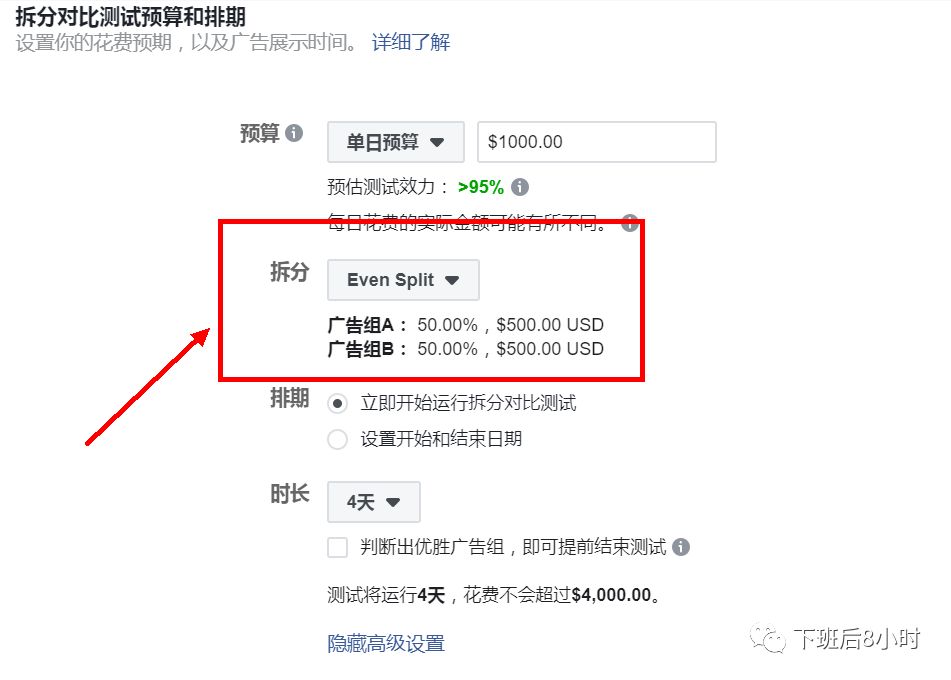 然后选择拆分预算时间和排期,给每个广告组变量的预算是可以按不同的百分比设置的,最好还是建议设置各站一半的预算
