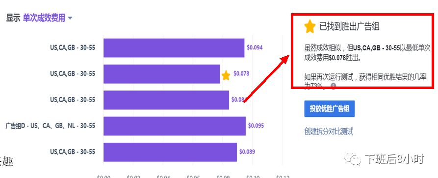 3.然后系统会根据广告目标,衡量每个广告组的表现,找到变现最收到的广告组,测试结果结束,你将会收到一份测试通知,告诉你哪个广告组胜出,然后你就可以对胜出的广告组追加预算,继续扩大受众规模.