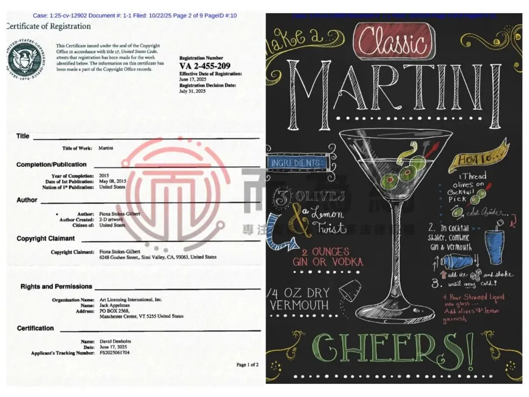 【侵权快讯】25-cv-12902 速看!Keith代理Fiona Stokes-Gilbert四张鸡尾酒元素插画发案!