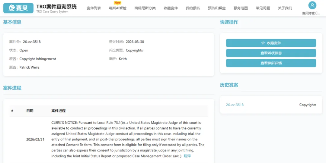 从赛贝TRO案件查询系统获悉,原告Patrick Weirs(已故艺术家Persis Clayton Weirs版权继承人)在2026年3月30日提交TRO版权侵权案件,涉及2张乡村动物插画作品,重点预警动物主题装饰画(帆布画为主)类目侵权风险,各位卖家务必高度重视,逐一排查自身产品!