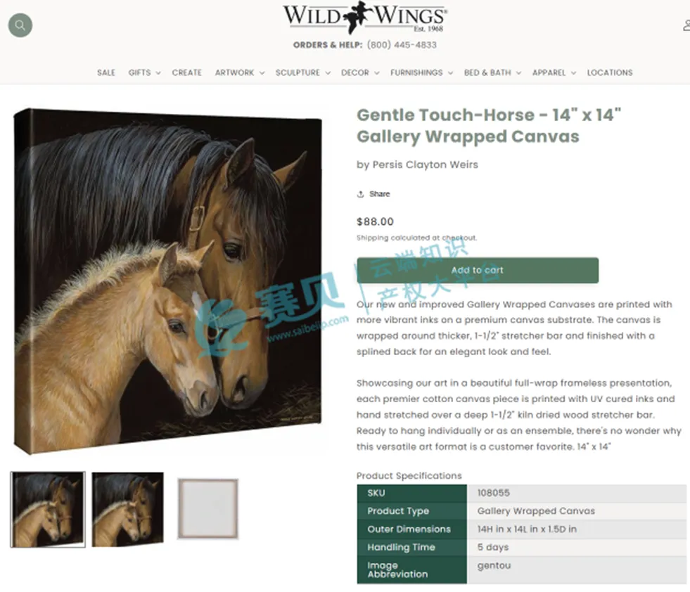 原告Patrick Weirs的核心版权资产,来源于其妻子Persis Clayton Weirs的艺术创作——Persis是美国知名自学成才艺术家,自幼擅长绘画,23岁起专注于马匹绘画,后拓展至各类野生动物题材,职业生涯中多次在美国各地及中国举办艺术展,获得众多奖项,其作品在欧美市场拥有极高的知名度和美誉度,相关装饰画产品深受消费者喜爱,商业价值极高。