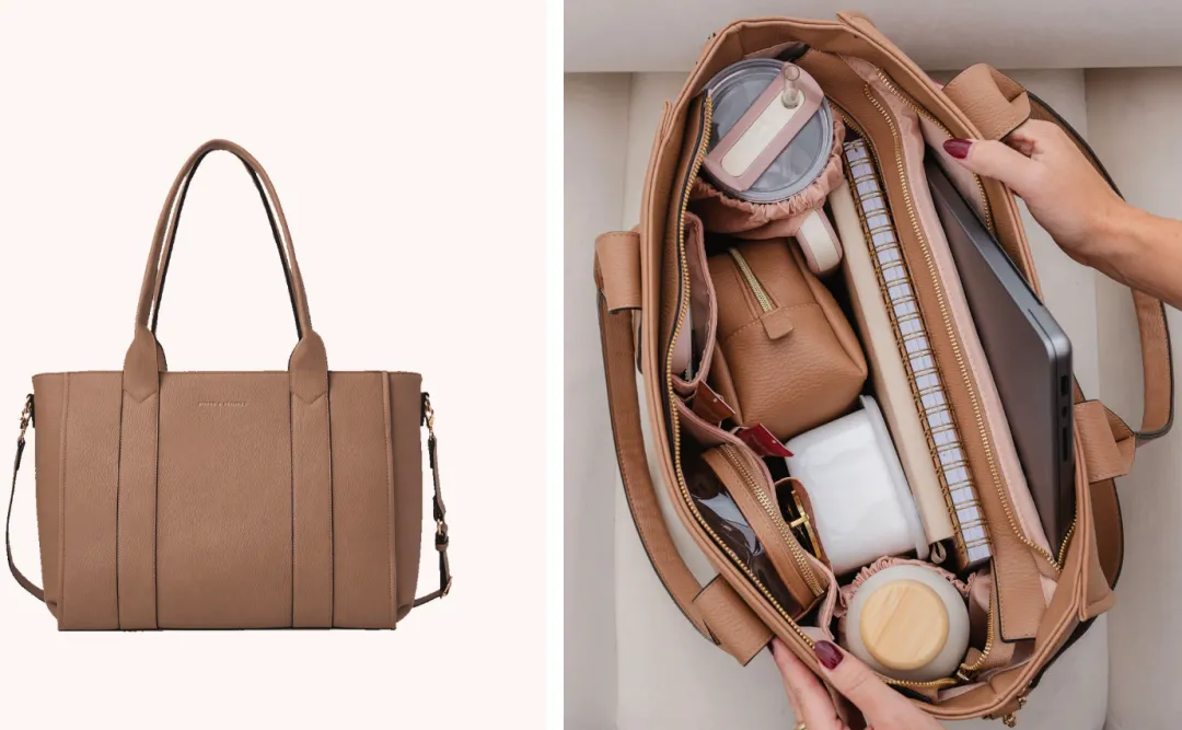 以热销包款Multitasker为例,它不仅有标准保温杯口袋,还有专为网红水杯Stanley设计的专属袋;电脑隔层带可拆卸衬垫,方便装电脑时提供保护,不装时减小体积;多个更小的口袋则设计用于放置手机、钱包、化妆包和口红。内部隔层材质由再生塑料瓶制成,外部材质为纯素皮革;售价约$73。