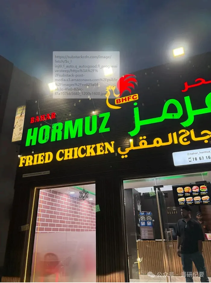 在阿曼剩下的时间里,我处于监视之下——三个人到处跟着我,每个转角都是同样的面孔,一辆车尾随我,其不试图掩饰的跟踪方式毫无微妙可言。工作人员极力想让我退房。感觉还算公平。我花一千美元雇了一辆黑色SUV带我转了最后几个小时——应该从一开始就到处撒钱,因为在这个价位上,人们会告诉你任何事情,带你去任何地方。在一家叫“霍尔木兹炸鸡”的地方吃了炸鸡。味道不错。