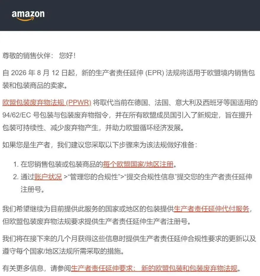 亚马逊欧洲站近日发布紧急通知,欧盟《包装废弃物法规》(PPWR)将于2026年8月12日正式生效,取代德国、法国、意大利及西班牙等国现行包装指令,在所有成员国统一实施更严格的环保标准。