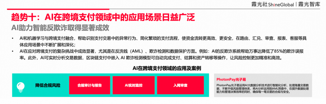 《报告》将AI技术在跨境支付领域的深度应用列为十大趋势之一。其指出AI在应对跨境支付的复杂挑战中成效显著,尤其是在反洗钱(AML)、欺诈检测和数据保护方面,让风险控制更加精准和高效。此外,针对对外贸易中汇率波动、汇损严重的痛点,AI也能提供智能化的解决方案,帮助企业在复杂多变的国际金融环境中优化资金管理。