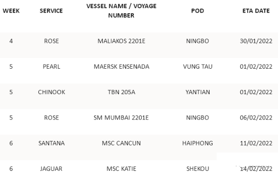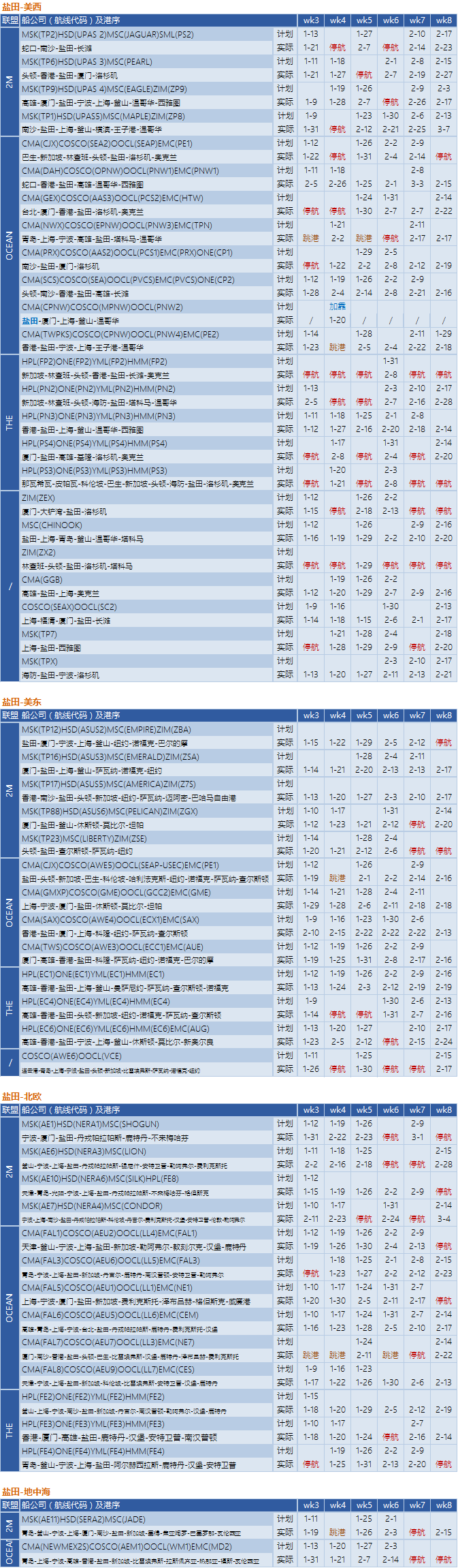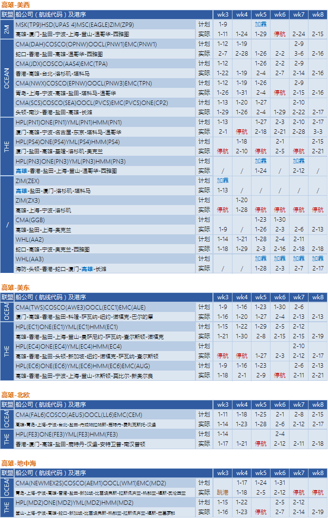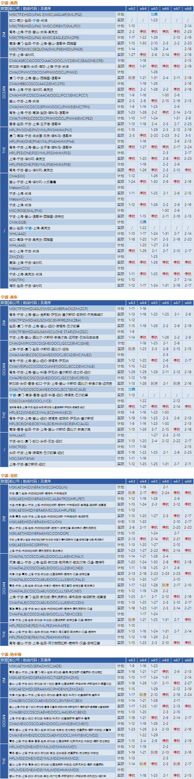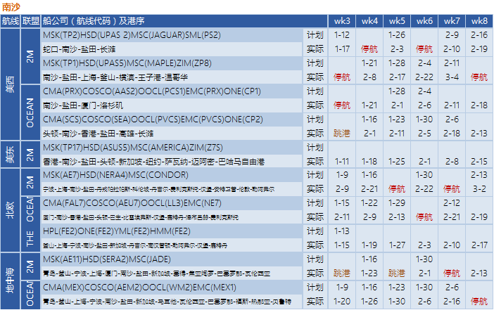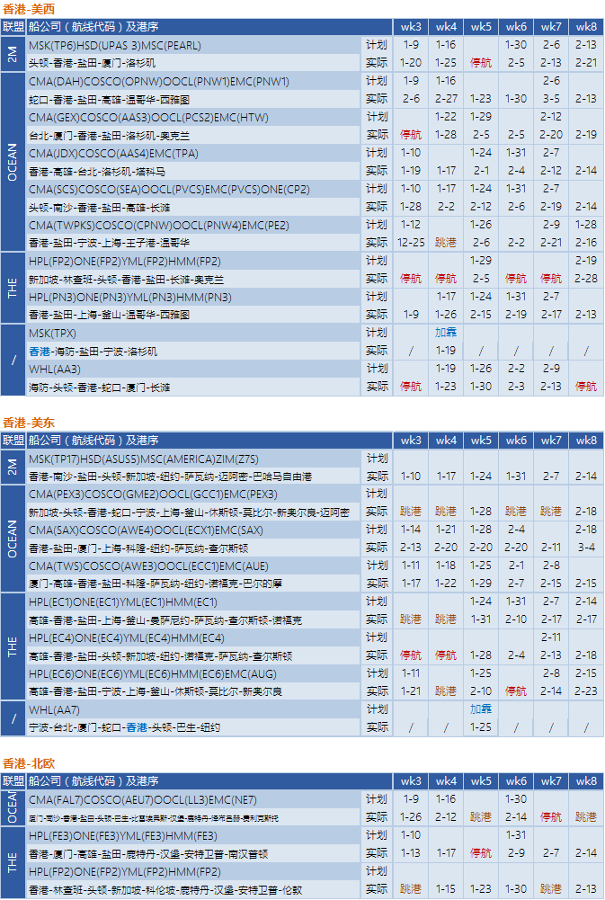 以下是容易船期统计的从中国出发到北美、欧洲和地中海的第03周-第08周(2022/1/9起-2022/2/19止)的停航跳港汇总: