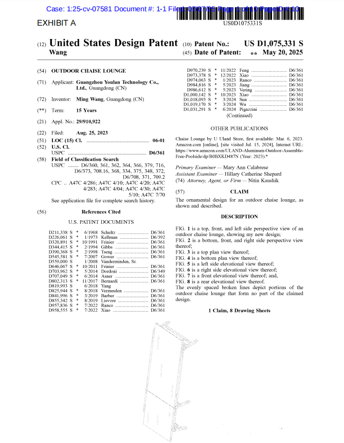 原告Guangzhou Youlan Technology Co. Ltd成立于2022年,聚焦新材料技术研发与家居创新,核心产品为户外躺椅。