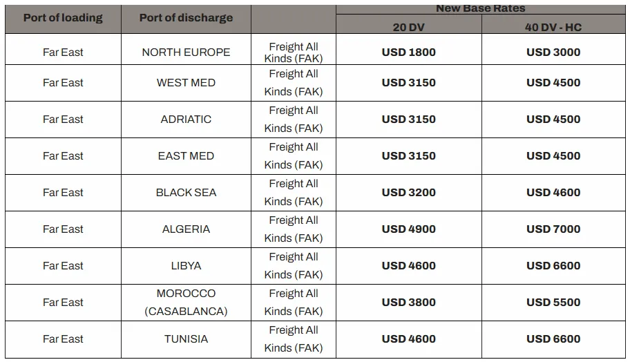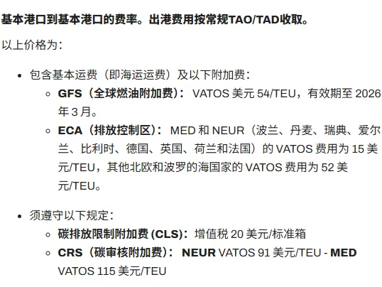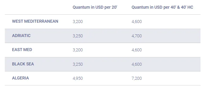 自2026年3月1日至14日期间,从亚洲所有港口至西地中海、亚得里亚海、东地中海、黑海、阿尔及利亚的所有干货、冷藏货、超限货物、空箱货适用新费率。