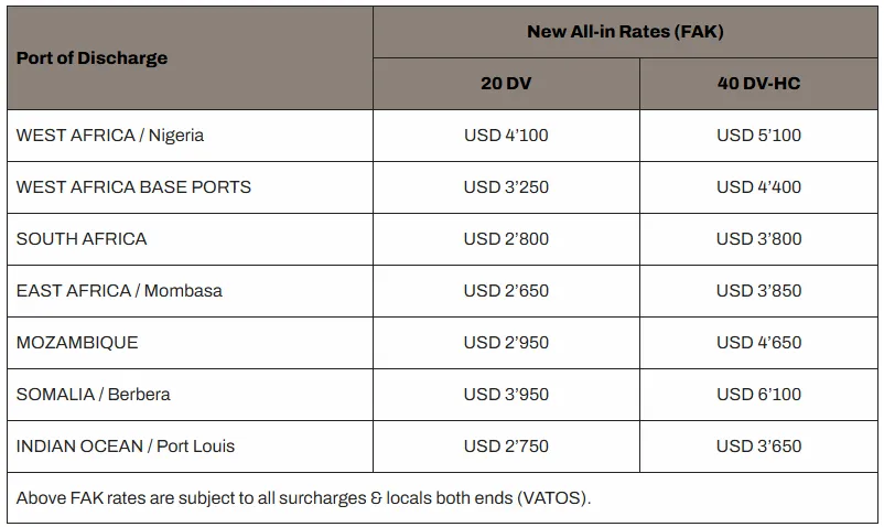 自2026年3月1日起至另行通知为止,但不超过2026年3月15日,从所有远东港口(包括但不限于日本、韩国和东南亚的港口)到所有撒哈拉以南非洲和印度洋港口的货运费率如下:
