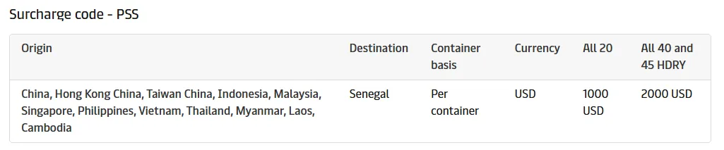 马士基将对中国大陆、中国香港、中国台湾、印度尼西亚、马来西亚、新加坡、菲律宾、越南、泰国、缅甸、老挝、柬埔寨至塞内加尔航线的旺季附加费(PSS)进行调整,自2026年3月1日起生效,直至另行通知。