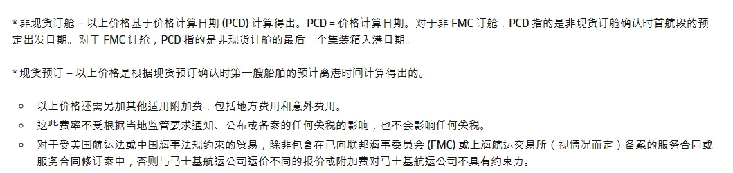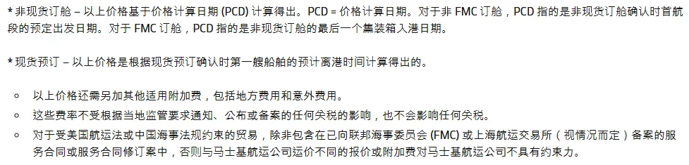 FAK不包括所有IMO类别商品和高价值商品;码头装卸附加费及其他适用费用可能另行收取。