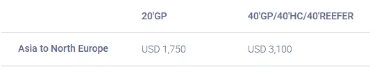自2026年3月1日(装船日)起,所有亚洲港口(包括日本、东南亚和孟加拉国)至所有北欧港口(包括英国以及从葡萄牙到芬兰、爱沙尼亚的整个区域)的干货、超限货物、空箱及冷藏货物新费率如下: