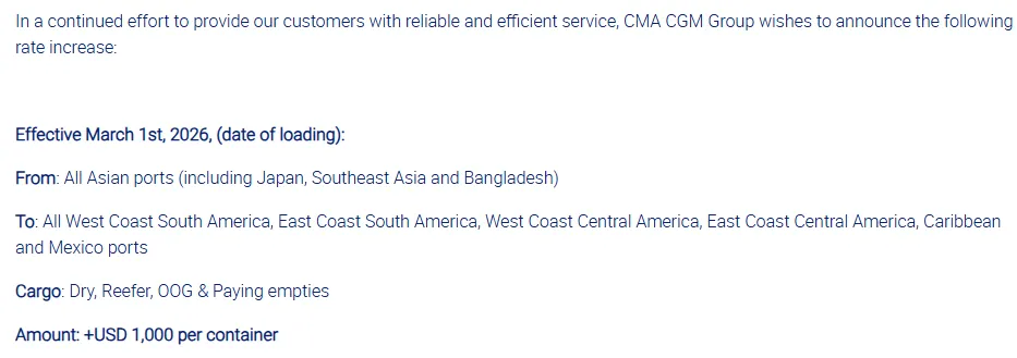 自2026年3月1日(装船日)起,所有亚洲港口(包括日本、东南亚和孟加拉国)至南美洲西海岸、南美洲东海岸、中美洲西海岸、中美洲东海岸、加勒比海地区及墨西哥所有港口的货物每个集装箱加收1,000美元。