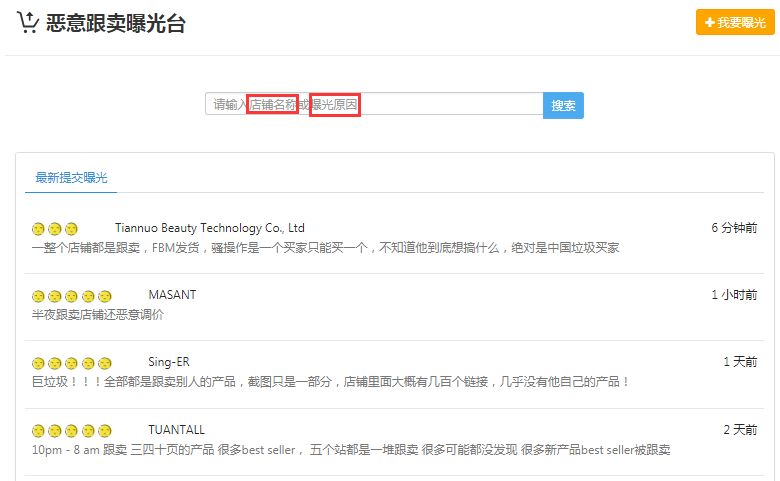 被跟卖的卖家可以打开并登录“卖家之家”网站,在导航栏中找到并点击“恶意跟卖曝光台”进入跟卖曝光台页面,在此页面中可以看到很多卖家曝光的跟卖信息,在搜索框中输入“店铺名称”或“曝光原因”,点击“搜索”按钮后,也能搜索到被曝光的跟卖者的相关信息。