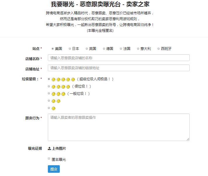 根据页面提示,填写好跟卖的“店铺名称”、“店铺地址”、“垃圾星级”、“跟卖行为”以及曝光证据的图片或其他资料,然后可以勾选或不勾选“匿名”进行提交即可,建议选匿名提交。