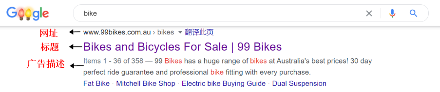 标题——吸引用户注意力 网址——指向网站特定的页面(即着陆页) 广告内容描述——凸显所售产品的详细信息