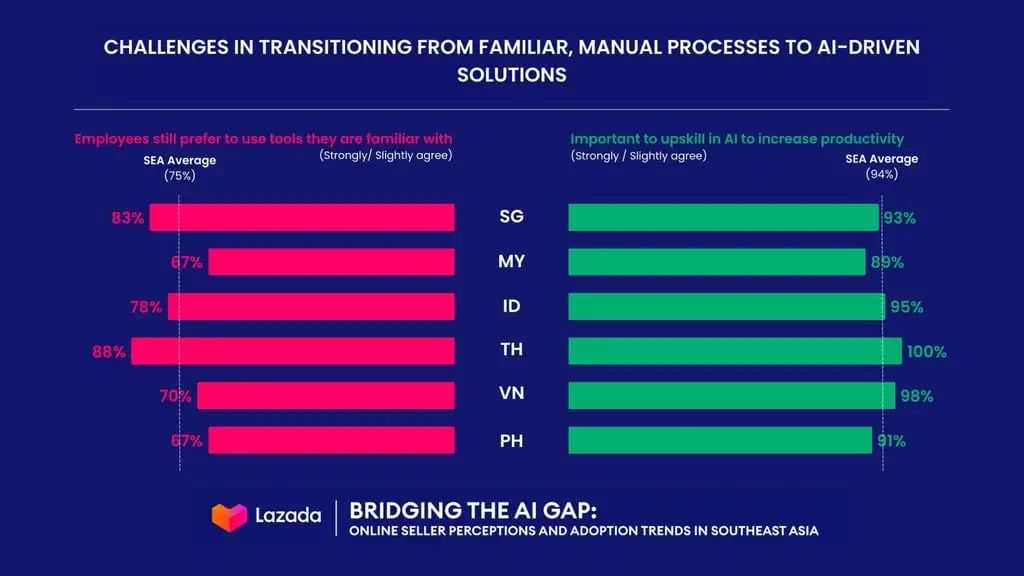Lazada与Kantar联合调查显示,93%的东南亚卖家计划借助AI推动增长,但实际应用率仅为34%。这一落差源于多重障碍:
