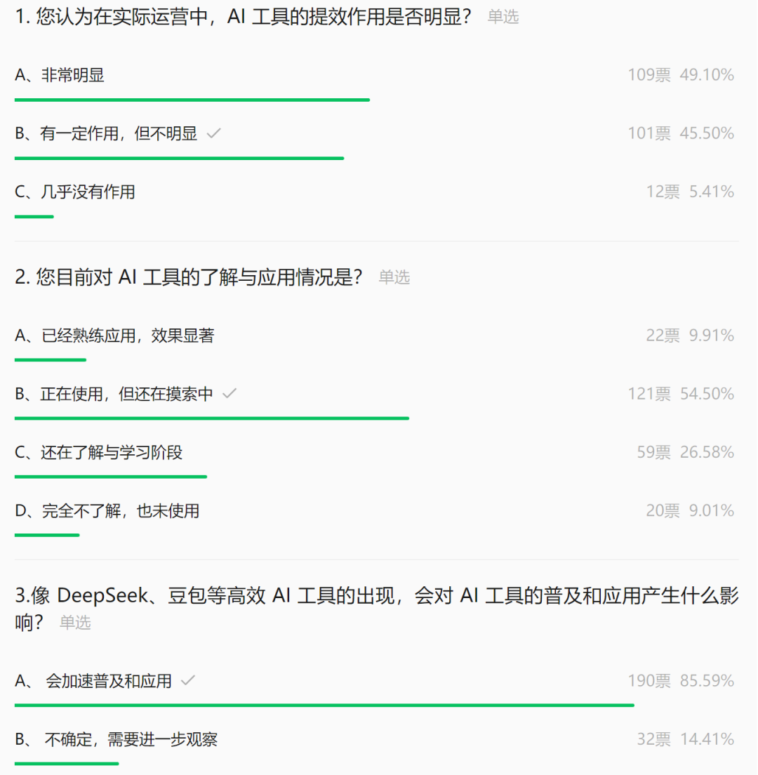 在上一篇关于AI工具使用情况的投票调查中,222位卖家的反馈揭示了明显的两极分化:49.09%的卖家认为AI成效显著,45.50%认为作用有限,5.41%直言几乎无效。这一数据表明,AI的实际价值高度依赖使用场景与策略适配。