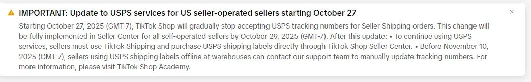 此前,TikTok Shop已通知卖家,自2025年10月27日(GMT-7)起将逐步停止接受自发货卖家的USPS订单跟踪号码。