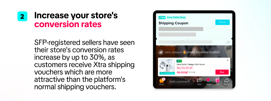据TT123了解,卖家在提报加入SFP之后,商品将得到官方授予的Xtra Shipping标识,这一标识将提升产品权重、曝光和转化,根据官方调研,部分卖家在加入该计划后转化提升至30%。