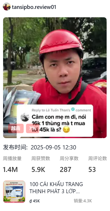 数据显示,近一周TikTok Shop越南站的视频带货榜中,一则由酷似快递小哥出镜的带货视频登上了周销TOP5。据了解,视频所带货的产品是口罩,近一周的带货销量4300+,另一则同样也是为口罩推广视频近一周带货销量也来到了4300的高位。