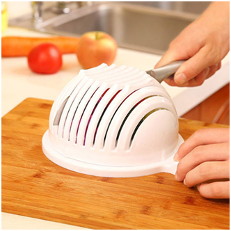 只要把原料放进有格栅的沙拉碗中,盖上盖子翻转过去,接着就能顺着格栅将水果、蔬菜等原材料切成薄片。如果你想把里面的水果蔬菜切成小块,可以稍微抬一下碗,45度转动手柄,然后再重复上述步骤即可。
