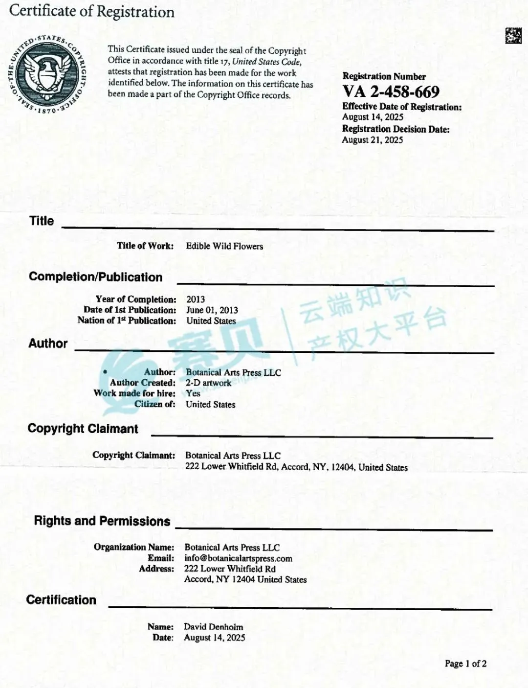 案件涉及1项 “可食用野花” 主题版权,覆盖12种植物插画,版权号VA 2-458-669,作品名为《Edible Wild Flowers》(《可食用野花》,包含 12 种野花的手绘插画及对应科普信息,跨境电商里,自然主题、科普类的文创产品一直是热门,不管是金属装饰牌、帆布画,还是园艺标签、笔记本,只要带植物插画,都得小心侵权。