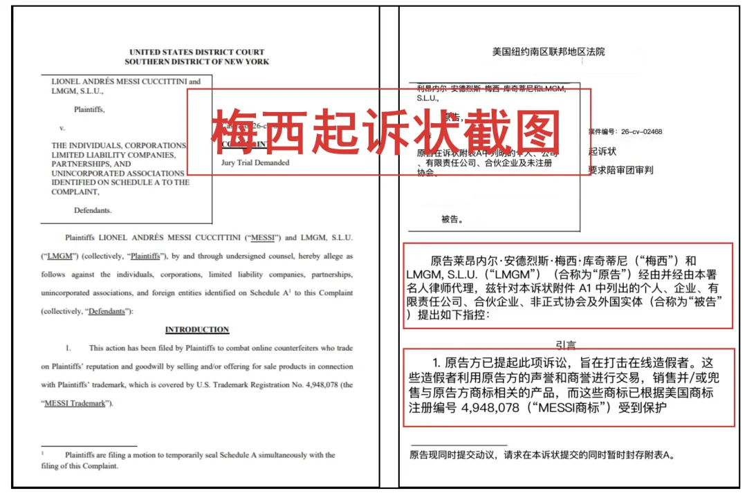 阿根廷"球王"梅西及其品牌管理公司(LMGM),已向美国纽约南区联邦法院提起诉讼,将Temu、Shein、沃尔玛等平台上的多名中国卖家列为被告。