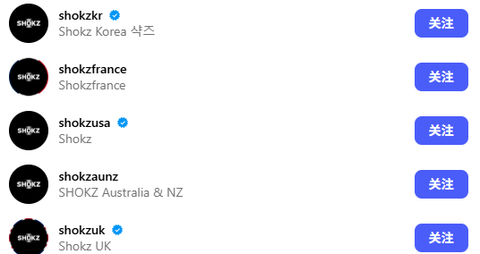 在 Instagram 上,Shokz 并没有采用单一的全球账号,而是选择了 分国别账号独立运营: