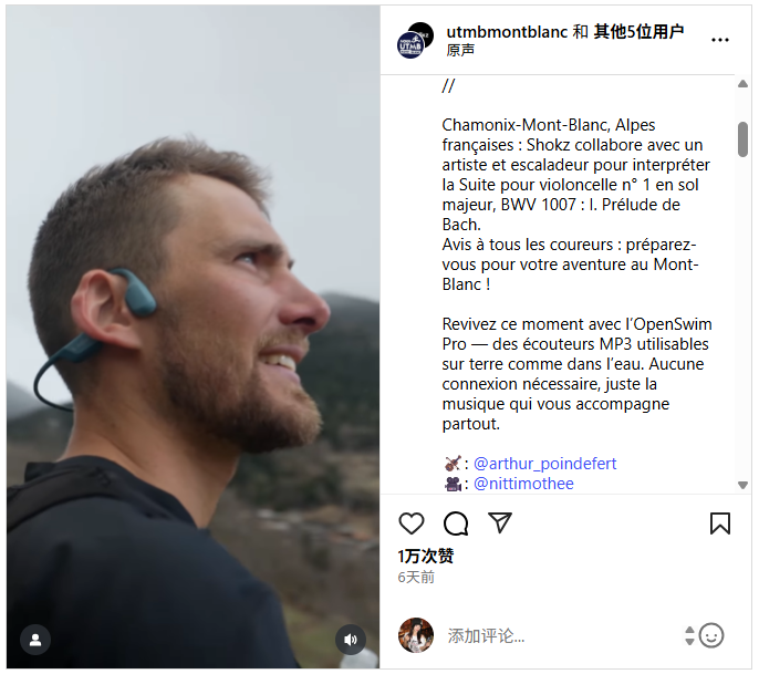 在 UTMB(环勃朗峰越野赛) 上,Shokz 作为官方合作伙伴,不仅做赞助曝光,还与跑者共创内容。