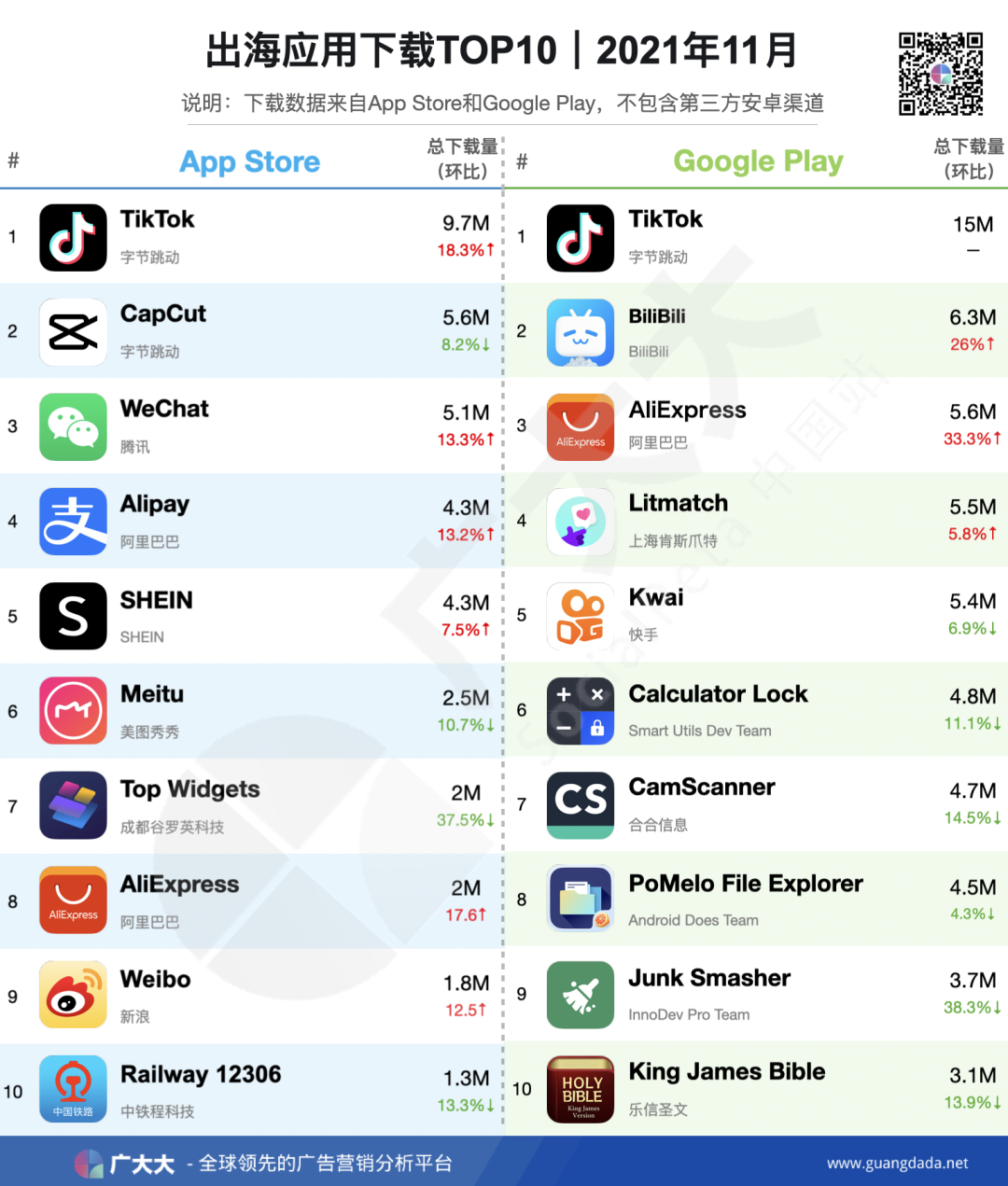根据广大大 App Intelligence 等模块数据,笔者整理出2021年11月出海应用(非游戏)下载、投放TOP10榜单,帮助更多移动应用从业人员了解全球移动市场变化趋势。