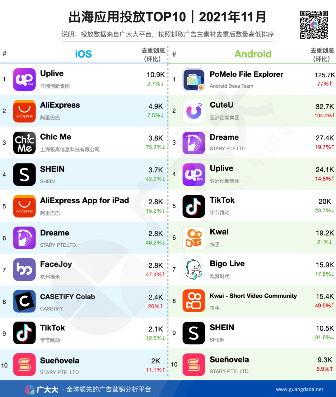 亚洲创新集团旗下直播产品【Uplive】11月稍稍降低了其iOS端投放量(约为0.9%),并加大了其Android端投放量(约为14.8%),双端合计去重创意数超过3万组。