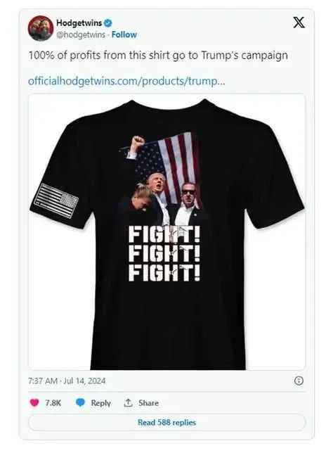2024年7月枪击事件后,Temu上架“血迹版T恤”,售价9.59美元;亚马逊多个卖家也迅速推出“特朗普挥拳”系列文化衫,订单激增。