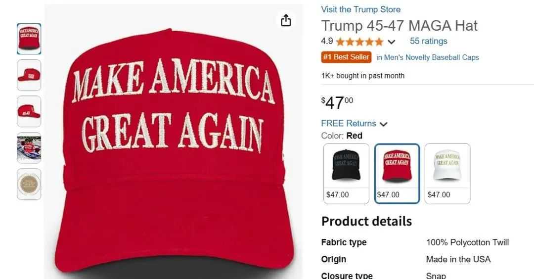 MAGA棒球帽售价47美元,尽管高出行业均价近一倍,但月销量破2000单,30天营收突破10万美元,评价4.9分口碑爆棚。