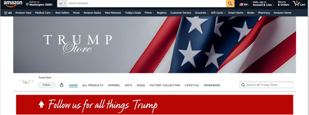 2025年4月:在亚马逊上线官方旗舰店“Trump Store”,主打服饰、家居等20余款商品。