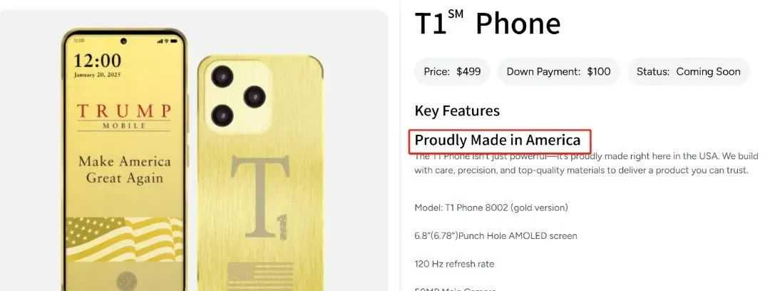 6月推出“Trump Mobile”移动通信服务,并推出T1智能手机,售价高达499美元,采用金色外壳+美国国旗元素设计,预计9月上市。