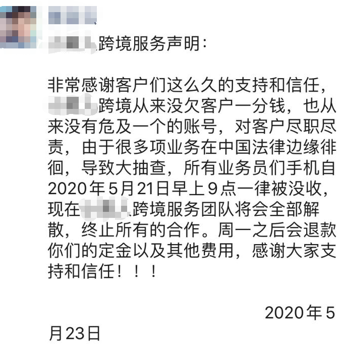 截图大概意思为:某跨境服务团队因为多项业务在法律边缘徘徊,导致其在5月21日被抽查,随后业务员手机被没收。在5月23日宣布该跨境服务团队解散,终止所有合作,退还客户的各项费用。