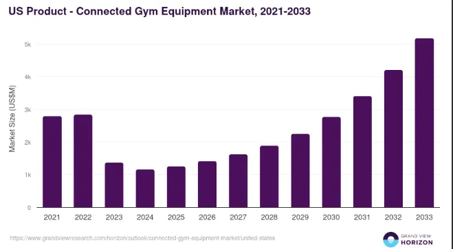 美国 connected gym equipment(智能连接健身设备)市场在 2024 年收入约 11.53 亿美元,预计到 2033 年将达到惊人的 51.75 亿美元,期间的 CAGR 高达 19.4%。